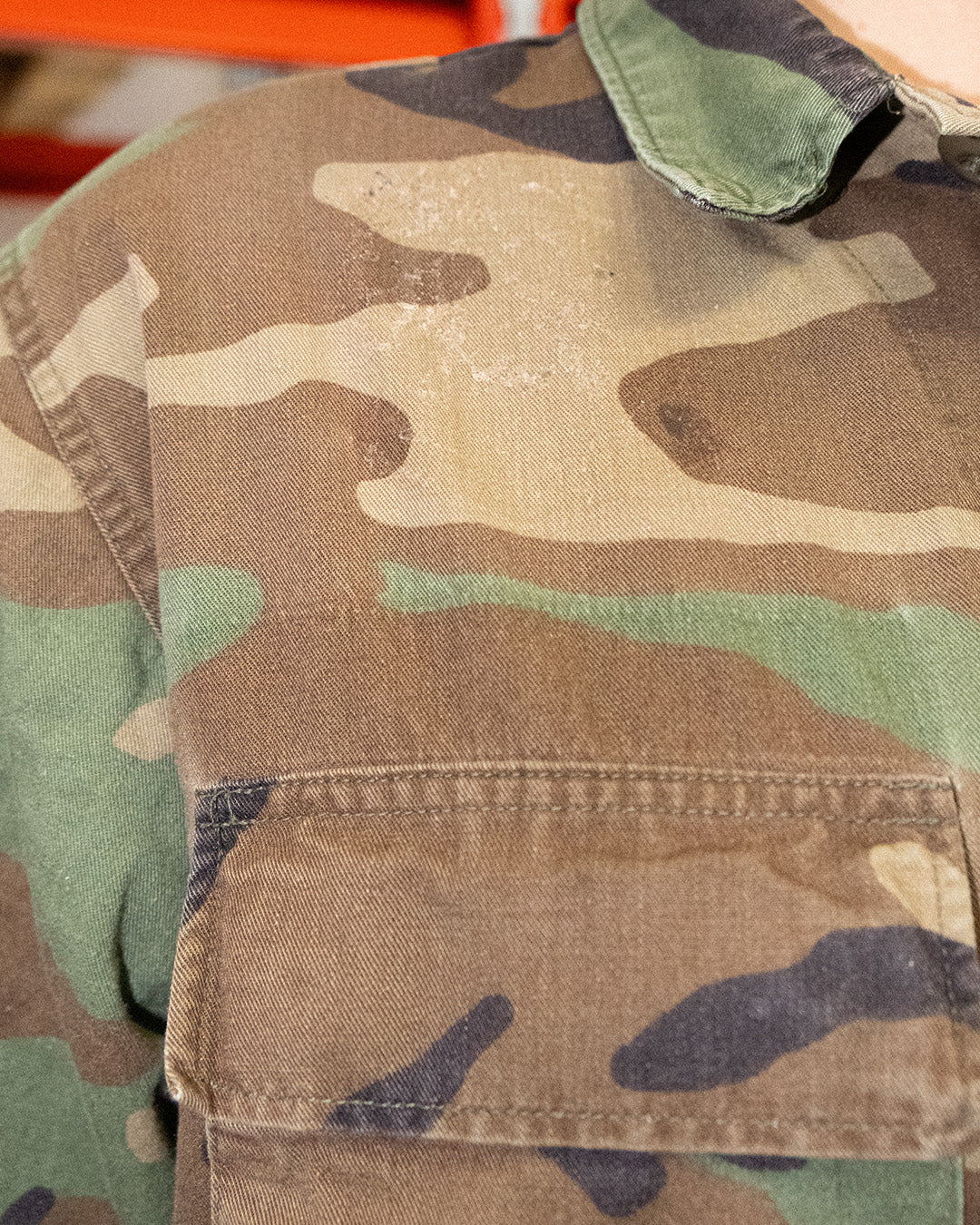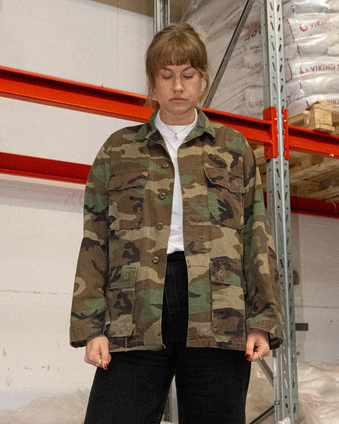 Denna pre-used Woodland jacka har fått nytt liv med exklusiva handgjorda chainstitch-patches.